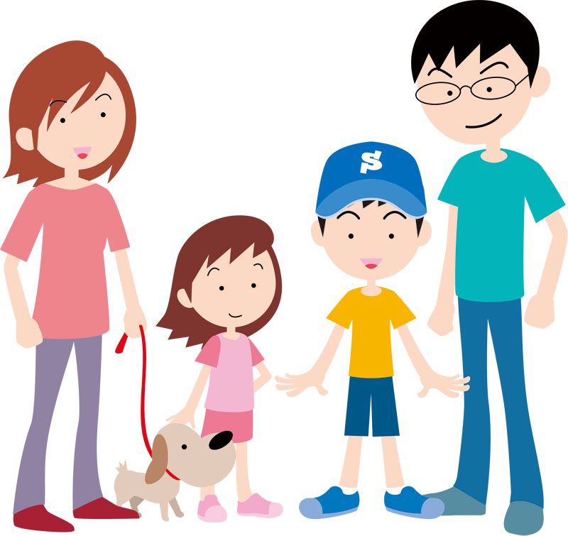 4人家族とペットの主線無しイラストです。