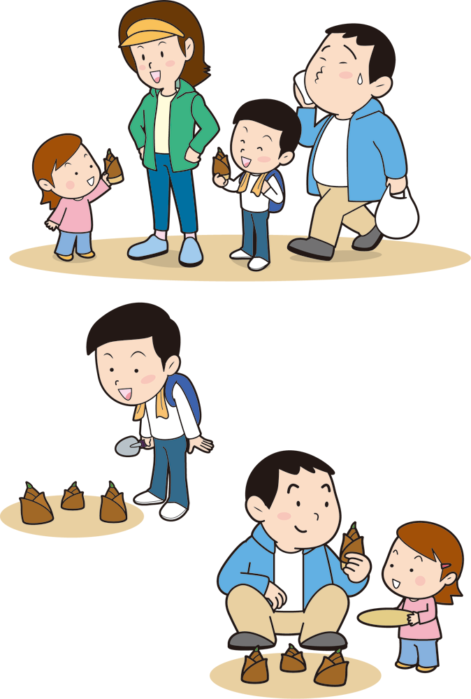 たけのこ狩り家族 2018.03.05 たけのこ狩りのシーズンは初夏。ゴールデンウィーク頃に楽しめます。 サイズ[337px×500px] 画像の上で右クリックし「名前を付けて画像を保存」でダウンロードしてください。 高解像度版は下の青いボタンからダウンロードできます。 “たけのこ狩り家族” をダウンロード 00363.png – 180 回のダウンロード – 234 KB