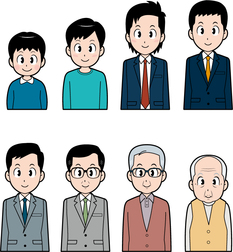 一人の人物として加齢の過程素材として使えるだけでなく三世代の家族素材としても使えると思います。女性バージョンもあります。