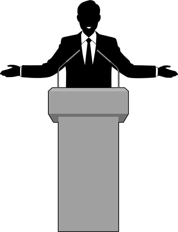 演台でスピーチする人のシルエットイラストです。国や会社、宗教など様々な組織のリーダーイメージとしてお使いください。女性バージョンもあります。